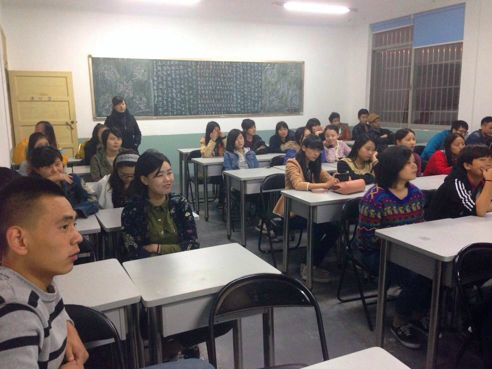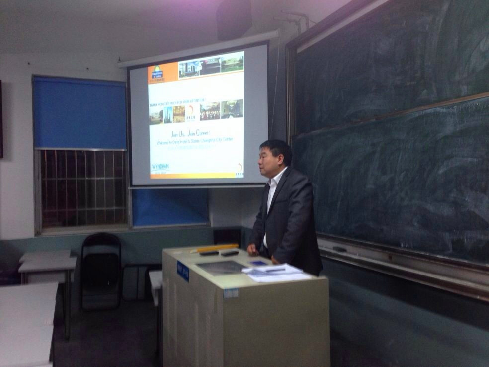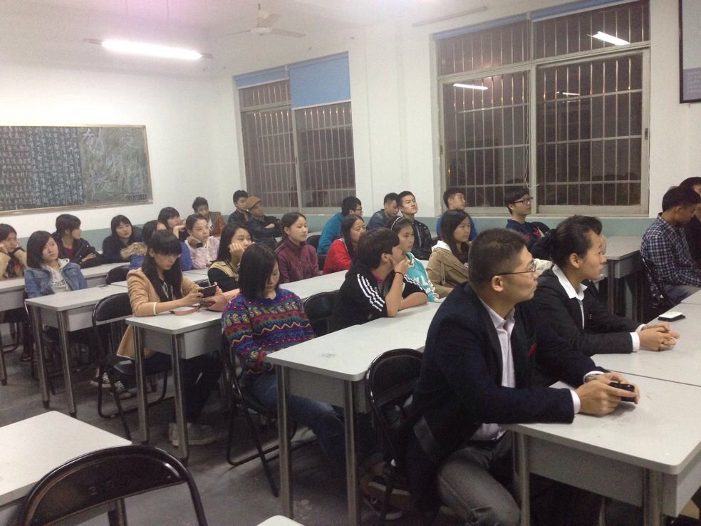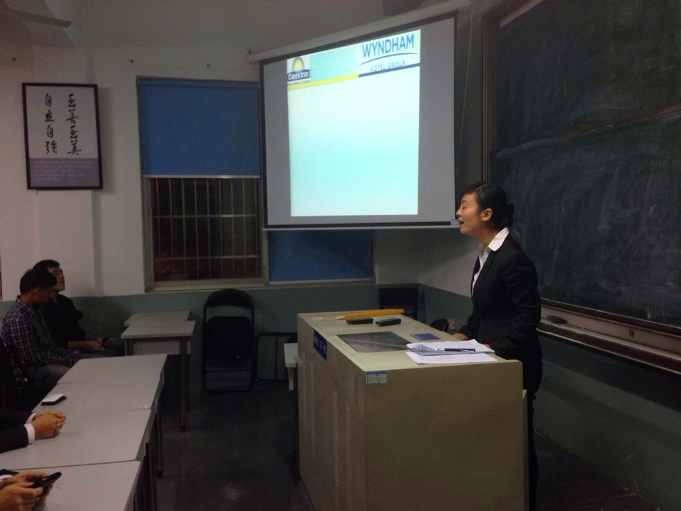 李助理陪同酒店代表团以及旅管专业全体同学在认真听讲。