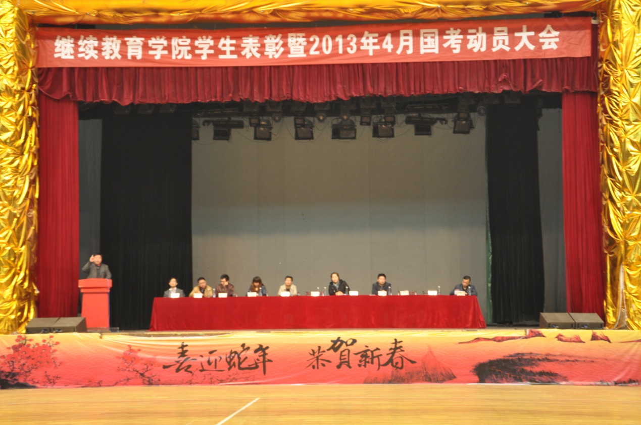 为了在学生中树立榜样,进一步加强学风、考风建设力度,同时动员学院全体学生认真复习,做好今年4月份的迎接国考准备工作,2013年3月29日下午,我学院在学校体育馆容重召开了继续教育学院学生表彰暨4月国考动员大会。