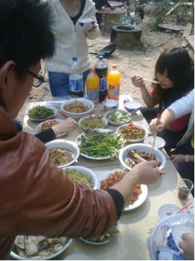 饭后,活动还未结束。在刷完碗和盘子,打扫好卫生后,大家开始进行娱乐活动。有的人三个一群,五个一伙,开始玩三国杀、纸牌等桌上游戏;有的人开始在农家乐里唱起卡拉ok;有的人开始为准备晚上的饭菜而奔忙。晚上,为了不浪费中午的食材,有的组买了一些配菜,开始煮火锅,有的组开始煮汤圆、饺子。晚饭后,清理好卫生,大家兴尽而归。